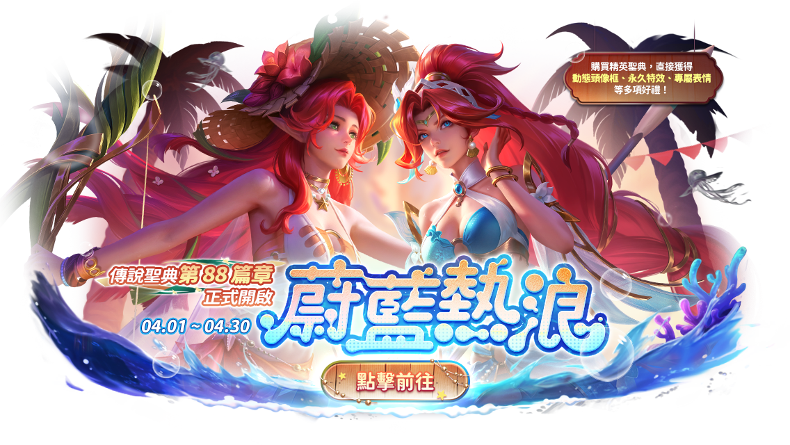 第88篇章聖典預購禮 上市時間: 2026 年 3 月 27 日(五)~ 2026 年 3 月 31 日(二) 23:59 止。 活動內容: 活動時間內,可購買第 88 篇章聖典超值預購,完成預購可獲得 海潮頌歌-艾翠絲造型+海潮頌歌-美娜造型+海潮頌歌-特爾安娜絲造型七日體驗卡+冷靜的特爾安娜絲表情(永久)+海潮頌歌擊殺(永久)+海潮頌歌回城(永久)+海潮頌歌加速(永久)+海潮頌歌特爾安娜絲裝扮-綠波輕吻+聖典第88篇章專屬相框 87、88篇章連續購買領好禮 活動時間: 2026 年 3 月 27 日(五)~ 2026 年 3 月 31 日(二) 23:59 止。 活動內容: 連續開啟聖典87、88篇章,可獲得海藍礦石x1。 ※ 連續購買獎勵將在聖典新篇章開啟後,於 4/1-4/7 開放領取。 ※ 如有活動相關問題,請於活動期間內至 客服中心 詢問。 海藍礦石兌換 活動時間: 2026 年 3 月 1 日(日)00:00 起 ~ 2026 年 5 月 31 日(日) 23:59 止。 活動說明: 活動期間內,蒐集海藍礦石達指定數量,可兌換永久造型及魔法水晶。 海藍礦石x10兌換: 雲非墨-特爾安娜絲 雲非墨-潘因 聖域:雷之魔導士-圖倫 聖域:風之魔導士-安奈特 魔境莊園-霧己 海藍礦石x6兌換: 楓計畫-霧己 魔女回憶錄·奇獸家-金納 先搗蛋再給糖-麥克思 桃心騎士-阿杜恩 桌面遊戲-靈靈 海藍礦石x1兌換: 魔法水晶x5 ※ 蒐集海藍礦石達指定數量,可兌換永久造型。 ※ 海藍礦石限活動獲得。 ※ 挑選獎項時請謹慎考慮,一旦領取將不予更換。 《傳說聖典》第八十八篇章 什麼是《傳說聖典》? 挑戰者們可以從大廳進入傳說聖典,聖典中共分60等級,等級獎勵分為Elite與Free通道,每一等級皆有相對應的特殊獎勵,你可以透過完成傳說聖典中的各種任務獲得貢獻值,亦可利用50點券(購買貢獻值)解鎖等級。此外,若挑戰者無法及時完成任務,亦可利用50點券解鎖等級。 如何開啟《傳說聖典》 Elite? 在畫面中的左下角開啟聖典後,即可獲得Elite通道的資格,挑戰者可以依據自己的意願,開啟不同的聖典: (勇者聖典與精英聖典只能擇一開啟,開啟後無法更改) 勇者聖典 售價:1700 375 點券 開啟即可獲得 ※ 限定造型:海潮頌歌-艾翠絲 精英聖典 +20 級 售價:3650 710 點券 開啟即可獲得 ※ 聖典第 88 篇章專屬相框 ※精英聖典 88 篇章專屬禮包( 打開獲得 特爾安娜絲海潮頌歌七日體驗卡+冷靜的特爾安娜絲表情(永久)+海潮頌歌擊殺(永久)+海潮頌歌回城(永久)+海潮頌歌加速(永久)+特爾安娜絲海潮頌歌裝扮-綠波輕吻+海藍礦石 ) 什麼是神聖任務? 傳說聖典中的神聖任務分為每日任務與挑戰任務,完成任務將可以獲得相對應的貢獻值,累積滿50貢獻值可升級1級聖典等級。 每日任務 1. 每日可領取指定任務 2. 每個任務維持72小時,期限後任務將自動消失。 3. 每個任務可以免費刷新一次,刷新任務並不會重置任務倒數! 3. 完成當週所有任務將獲得額外任務寶箱 《傳說聖典》第八十八篇章獎勵 等級 Elite Free 1 限定造型:海潮頌歌-艾翠絲 魔法水晶 2 第 89 篇章貢獻值 250 點 奧義碎片*500 3 魔法水晶 奧義碎片*500 4 4 勝經驗卡 奧義碎片*500 5 伯頓 的舞蹈 造型專屬碎片*10 6 奧義碎片*500 奧義碎片*500 7 大喇叭、寶石*10 奧義碎片*500 8 英雄專屬碎片*20、造型專屬碎片*5 9 3日隨機體驗卡、英雄專屬碎片*5 奧義碎片*500 10 蘭鐸 的舞蹈 英雄專屬碎片*10 11 造型專屬碎片*20、寶石*10 奧義碎片*500 12 寶石*50 13 4勝經驗卡 奧義碎片*500 14 魔法水晶*1、英雄專屬碎片*5 15 聖典專屬- 海潮頌歌加速 特效 (45天) 100點造型抵用券 16 奧義碎片*500 17 安格列 的舞蹈 18 奧義碎片*500、寶石*10 奧義碎片*500 19 英雄專屬碎片*20、造型專屬碎片*5 20 限定造型:海潮頌歌-美娜 奧義碎片*500 21 造型專屬碎片*20、寶石*10 22 寶石*50 23 魔法水晶*1 24 4勝經驗卡、英雄專屬碎片*5 25 特爾安娜絲 頭像 英雄專屬碎片*10 26 奧義碎片*500 27 3日隨機體驗卡 28 英雄專屬碎片*20、寶石*10 29 3日隨機體驗卡、造型專屬碎片*5 30 造型3選1:拂曉晨光-蘇離、不滅戰魂-亥犽、驚悚魔術-阿萊斯特 或海藍礦石*1 造型3選1:賞金獵手-龍馬、神廟祭司-金納、皇庭魅影-愛里 31 4勝經驗卡、寶石*10 32 50寶石 33 魔法水晶*1 34 4勝經驗卡、英雄專屬碎片*5 35 蘇離 的舞蹈 造型專屬碎片*10 36 奧義碎片*500 37 大喇叭 38 英雄專屬碎片*20、寶石*10 39 50寶石、造型專屬碎片*5 40 英雄5選1:安格列、齊爾、艾瑞、莉莉安、堇 或 海藍礦石*1 之中選擇其一獲得 魔法水晶*1 41 造型專屬碎片*20、寶石*10 42 星葵 的舞蹈 43 魔法水晶 44 奧義碎片*5000 45 聖典專屬-海潮頌歌回城 特效 (45天) 魔法水晶*1 46 伊格 的舞蹈 47 造型專屬碎片*20 48 改名卡、寶石*10 49 英雄專屬碎片*20、造型專屬碎片*5 50 造型3選1:( 補教名師-祖卡、紅鬍子海盜-夸克、冰雪皇后-盧蜜亞 ) 或 夜海魅影裝扮 之中選擇其一獲得 魔法水晶*1 51 造型專屬碎片*20、寶石*10 52 3日隨機體驗卡 53 魔法水晶*1 54 100點英雄抵用券、英雄專屬碎片*5 55 海藍礦石*1 寶石*50 56 奧義碎片*5000 57 寶石*50 魔法水晶*1 58 英雄專屬碎片*20、寶石*10 59 3日隨機體驗卡、造型專屬碎片*5 60 限定造型:海潮頌歌-特爾安娜絲 ※ 英雄造型選擇卡領取後可於「背包→道具」欄位中查看道具,點擊使用可選擇指定的英雄與造型。 《傳說聖典》第88篇章命運輪盤 什麼是命運輪盤? 當挑戰者在《傳說聖典》中達到60級時,命運輪盤將會自動開啟。透過完成神聖任務收集貢獻值,在命運輪盤中獲得各種獎品,獎勵內容會依當期篇章更