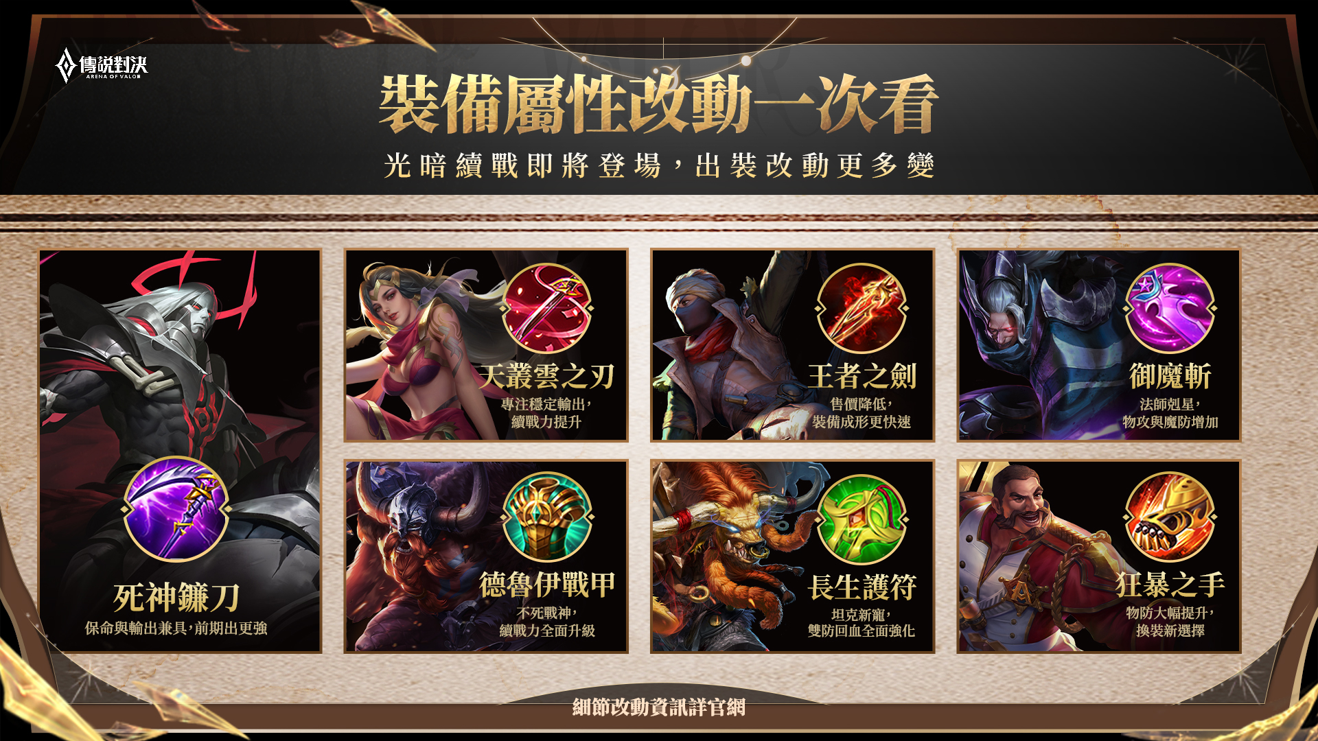 我們觀察到當前版本環境中,英雄職業之間存在一些不平衡的現象,這不完全表現在英雄勝率上,還表現在對職業特性的侵占。比如坦克在後期因為穿透的原因得不到應有的坦度,而刺客也有他們的困擾,孱弱的生存能力,讓他們只有以暴制暴殺出一片天。在本次更新調整中,我們嘗試扳回這種扭曲的對攻態勢,讓英雄回歸他們的職業特色,我們調整了死神鐮刀的被動機制,讓他可以更好的保護脆皮英雄,同時我們也對天叢雲之刃的屬性做了一些置換調整,等等。希望我們能在新版本中看到一個更有博弈性,對抗性的環境。