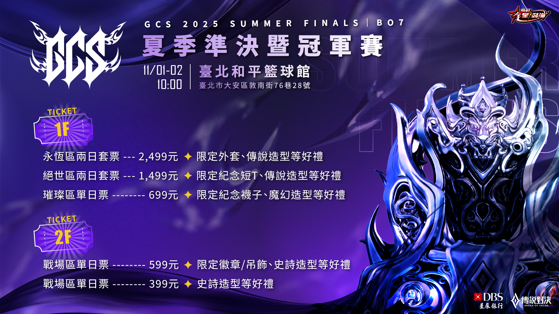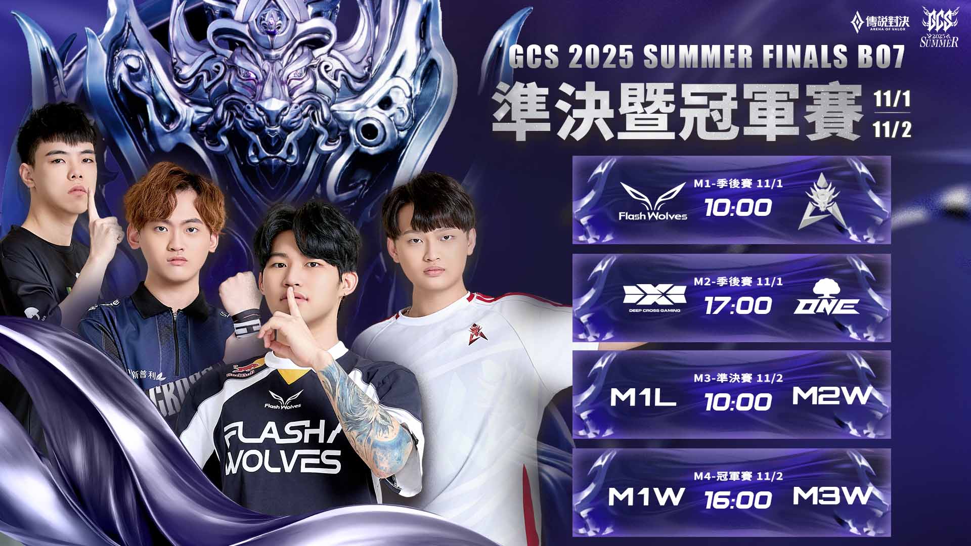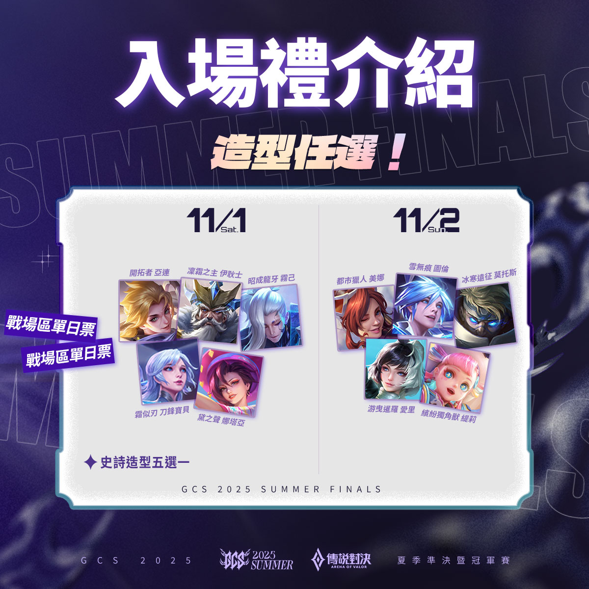 《Garena 傳說對決》GCS 2025 夏季總決賽將於 11 月 1 日(六)至 11 月 2 日(日)在臺北和平籃球館盛大登場。本次賽事為 GCS 歷年規模最大的一屆,更首度採兩日制舉行線下總決賽。四支頂尖隊伍:FW(Flash Wolves)、HKA(Hong Kong Attitude)、DCG(Deep Cross Gaming)與 ONE(ONE Team)將在總決賽舞台上展開最終對決,爭奪冠軍榮耀與新台幣 250 萬元的總獎金。11 月 1 日率先登場的為夏季賽季後賽,準決賽及冠軍賽則將於 11 月 2 日隆重展開。