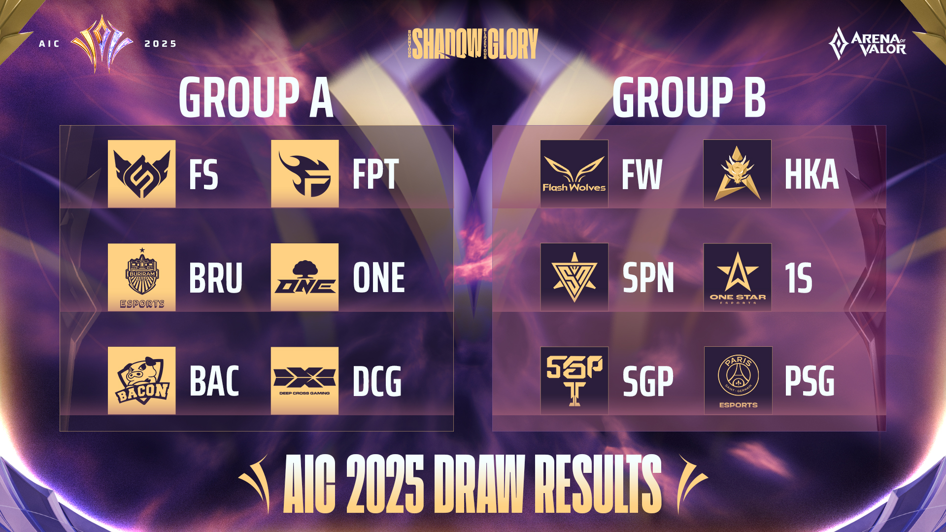 - Group A: Full Sense、 FPT x Flash、 Buriram United Esports、 Cathay ONE Team、 Bacon Time、 Deep Cross Gaming