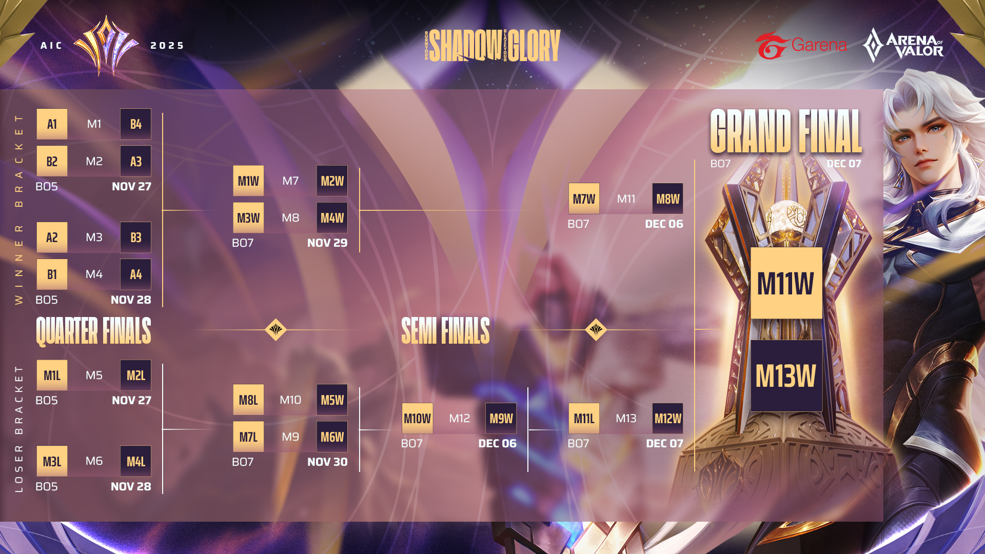 【八強賽】11 月 27 日至 30 日 展開雙敗淘汰戰: 八支晉級隊伍將於 11 月 27 日至 30 日進入淘汰賽階段,採用 雙敗淘汰制(Double Elimination)。八強賽與敗部賽事將採 五戰三勝制(BO5),勝部賽事與後續賽程則改為 七戰四勝制(BO7)。