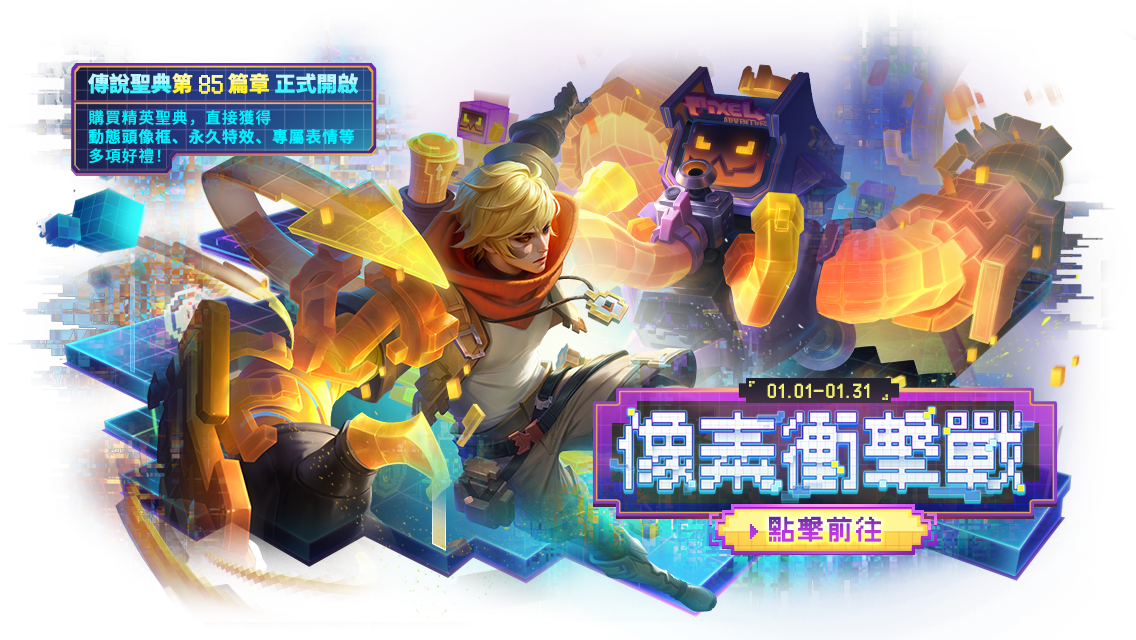 ※精英聖典 85 篇章專屬禮包( 打開獲得 埃羅像素風暴七日體驗卡+咬牙切齒的埃羅(永久)+像素風暴擊殺(永久)+像素風暴回城(永久)+像素風暴加速(永久)+埃羅像素風暴裝扮-碧綠位元+粉礦石 )