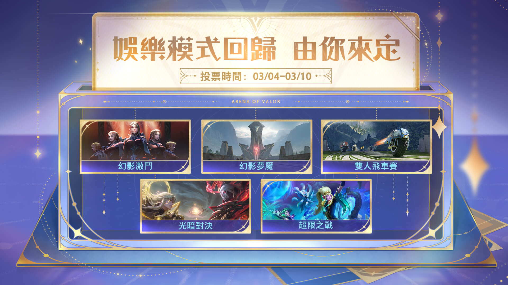 限時投票|娛樂模式回歸!投票第一階段開跑啦。每天登入就有 2 枚投票幣,可以支持你最愛的娛樂模式!最高票的模式會在 3/18~3/31 限時開啟,挑戰者們千萬別錯過!